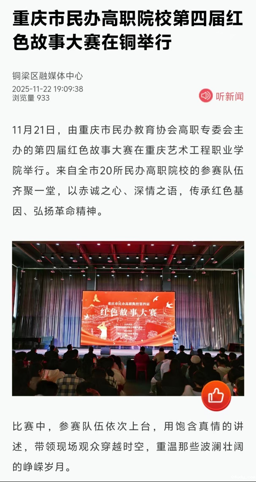 铜梁融媒体中心:重庆市民办高职院校第四届红色故事大赛在铜举行 阅读:次 更新时间: 2025-11-30 摄影:| 编辑:liaobing 原文链接:https://shareapp.cqliving.com/10/h5/article/1441837909138837504/h5/content_1441837909138837504.html 上一篇:中国教育在线:传承红色基因,赓续精神血脉!重庆市民办高职院校第四届红色故事大赛圆满落幕 下一篇:最后一页 分享到