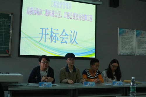 10月15日,星空棋牌苹果版工程造价管理系在铜梁校区举行了2013级招投标实训(高新园拓D二期D5栋公区、D7栋公寓室内装饰工程)开标会议。星空棋牌苹果版副理事长雷秀君、副院长何全先参加本次开标会,工程造价管理系全体老师也都参加了这次会议。