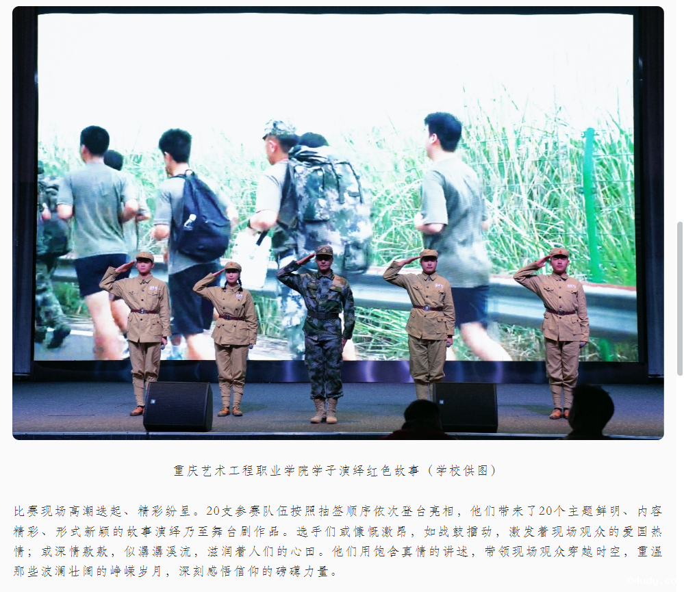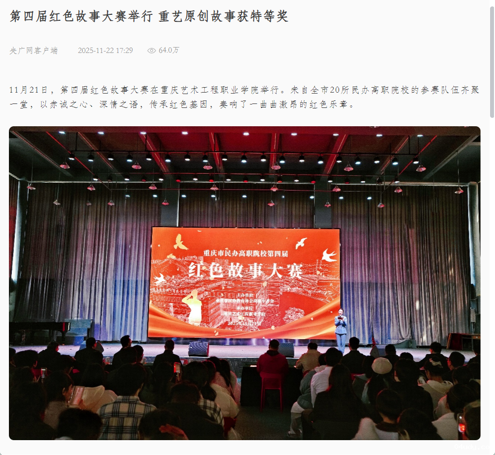 央广网:第四届红色故事大赛举行 重艺原创故事获特等奖 阅读:次 更新时间: 2025-11-25 摄影:| 编辑:liaobing 原文链接:https://apicnrapp.cnr.cn/html/share.html?id=30402887&ui=b1MIJwm7mNzPjysH0Nk6efkithJ6XPxxgpO92JQXASO+B60kxY2LM+8SQ0uIF+PG&action=share&type=1 上一篇:新华社:第四届红色故事大赛成功举行 原创少云故事获特等奖 下一篇:重庆市高等教育学会:重庆民办高职院校第四届红色故事大赛 奏响“思政教育+故事宣讲”立德树人乐章 分享到