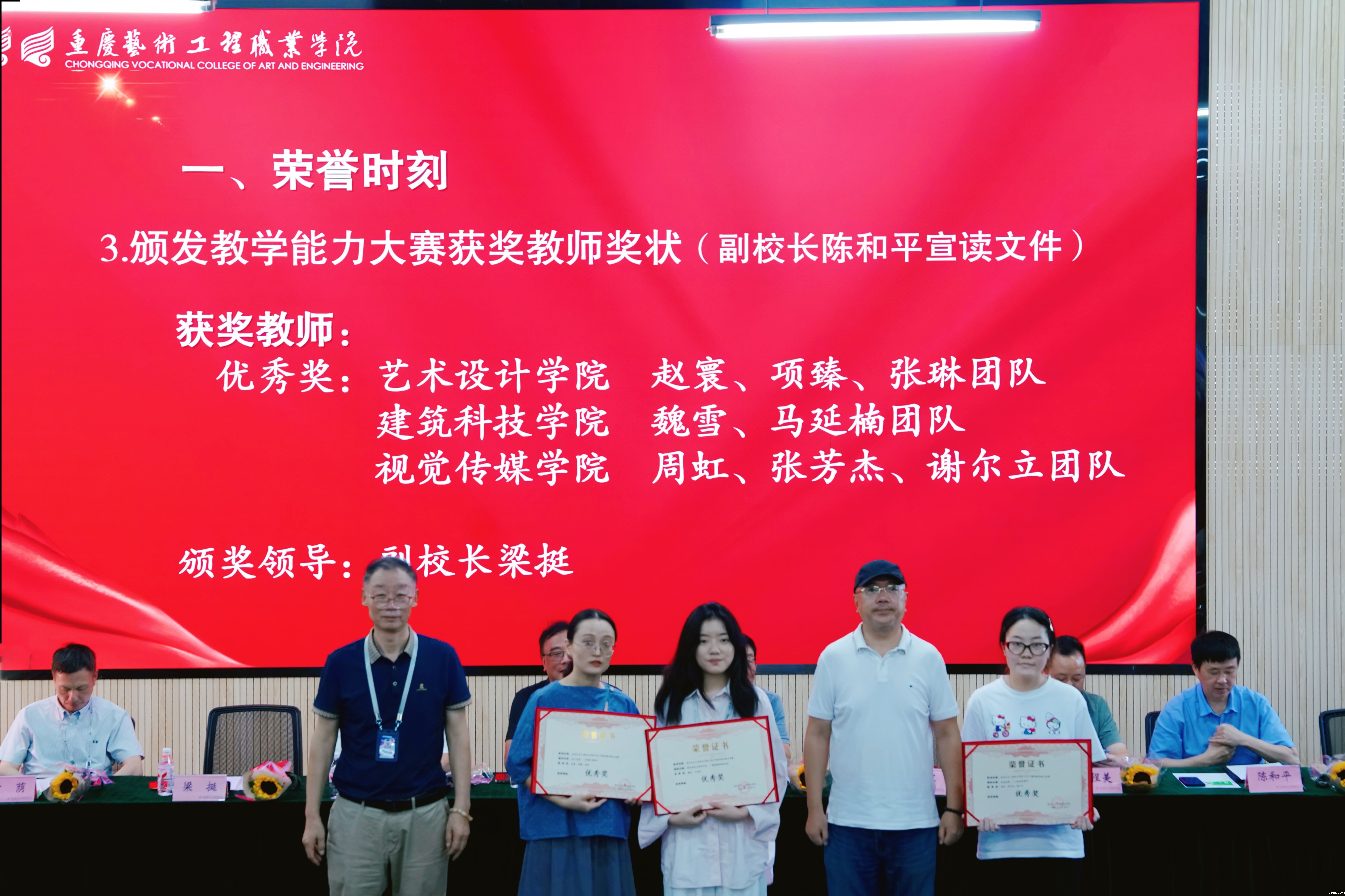 陈和平宣读教学能力大赛获奖名单。艺术设计学院赵寰、项臻、张琳团队,建筑科技学院魏雪、马延楠团队,视觉传媒学院周虹、张芳杰、谢尔立团队获得优秀奖。肖跃军、梁挺为这3个团队颁奖。