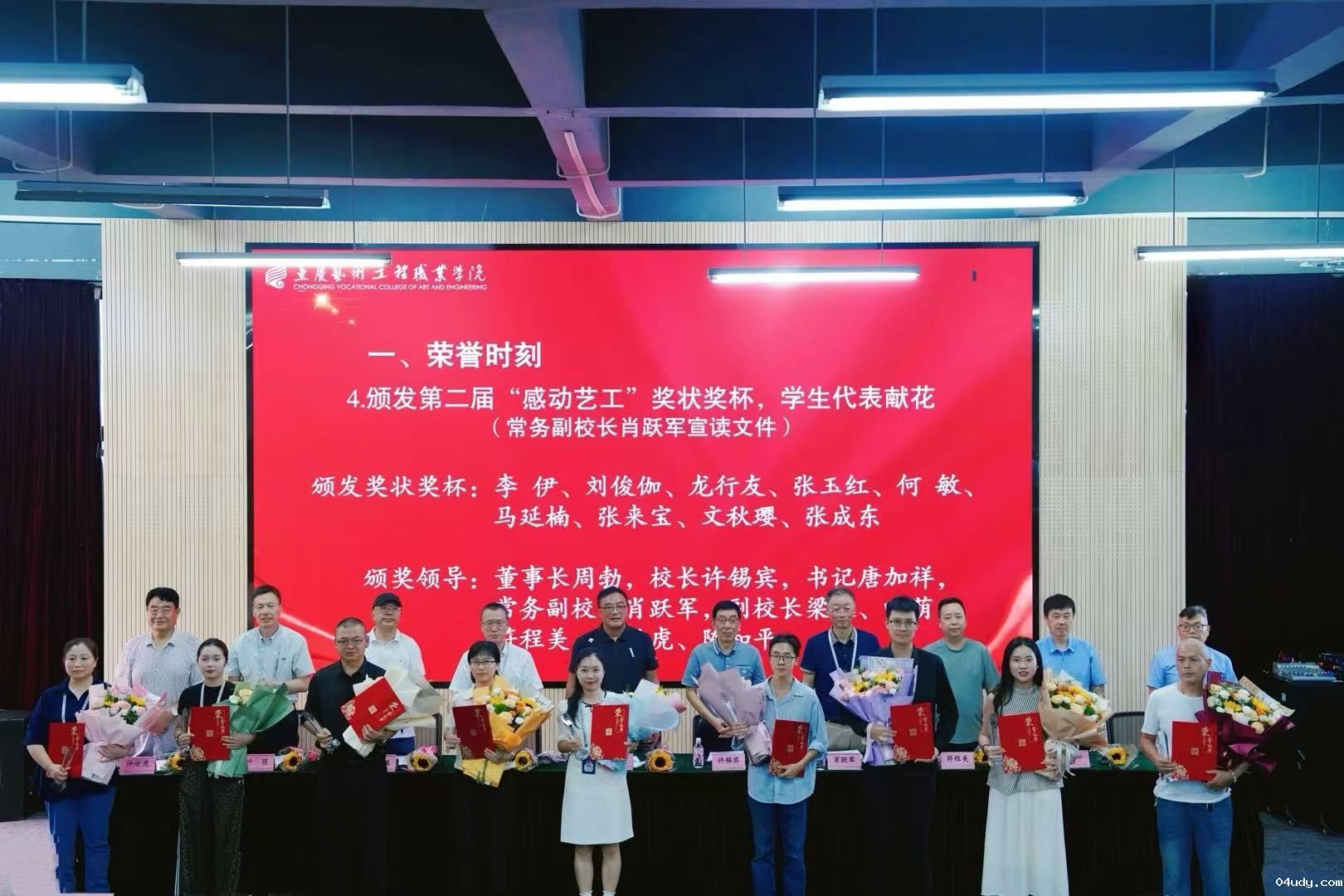 肖跃军宣读第二届“感动星空下载安装入口”获奖名单,李伊、刘俊伽、龙行友、张玉红、何敏、马延楠、张来宝、文秋璎、张成东9名教师获此殊荣。学生代表上台献花,全体校领导为他们颁发奖状和奖杯。