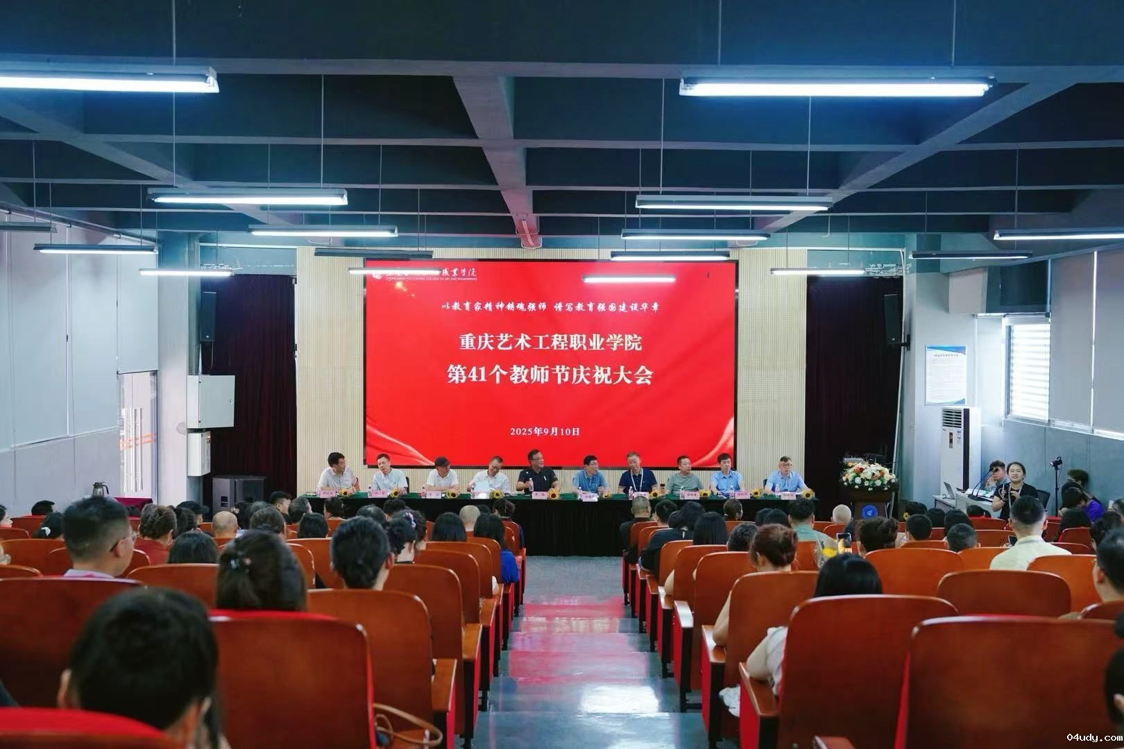 2025年9月10日,我校第四十一个教师节庆祝会在F101报告厅举行。重庆港鑫教育集团董事长周勃,我校校长许锡宾,党委书记唐加祥,副校长梁挺、徐永恒、叶萌、符程美、许世虎、陈和平以及各单位负责人、各总支支部书记、中青年骨干教师代表、辅导员代表、管理人员代表、2025年全体新入职人员、获奖教师、学生代表参与活动。会议由徐永恒副校长主持。