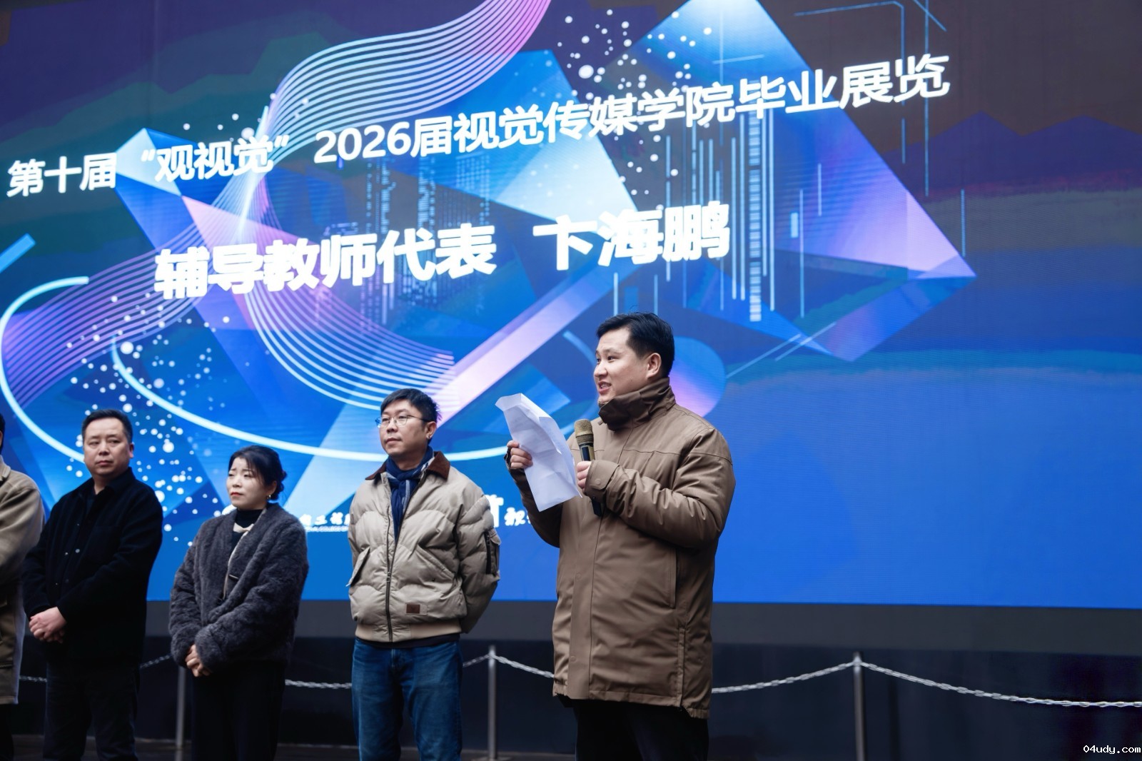 毕业生指导教师代表卞海鹏发言。他表示,毕业设计是同学们三年学习成果的集中呈现,是从学习者向设计者、实践者转变的重要节点,它不是终点而是新起点。他期望同学们始终保持学习的初心,做到自律、自信、自强,在未来的道路上不断追求卓越。他预祝本次毕业设计展览取得圆满成功,祝愿各位毕业生前程似锦、未来可期,也祝愿学校桃李满天下。