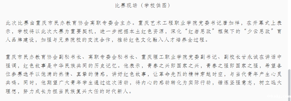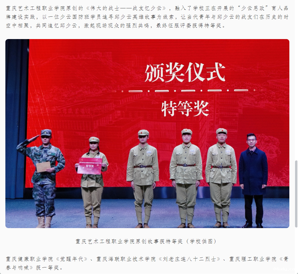 央广网:第四届红色故事大赛举行 重艺原创故事获特等奖 阅读:次 更新时间: 2025-11-25 摄影:| 编辑:liaobing 原文链接:https://apicnrapp.cnr.cn/html/share.html?id=30402887&ui=b1MIJwm7mNzPjysH0Nk6efkithJ6XPxxgpO92JQXASO+B60kxY2LM+8SQ0uIF+PG&action=share&type=1 上一篇:新华社:第四届红色故事大赛成功举行 原创少云故事获特等奖 下一篇:重庆市高等教育学会:重庆民办高职院校第四届红色故事大赛 奏响“思政教育+故事宣讲”立德树人乐章 分享到